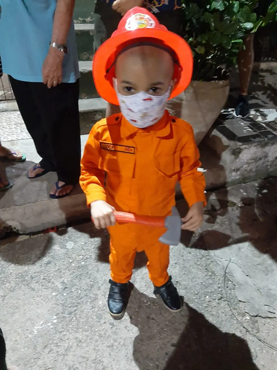 Lucca estava vestido a caráter, fardado, com capacete e machadinha. O menino brincou com os amigos e aproveitou a presença dos seus heróis Bombeiros, segundo a mãe.