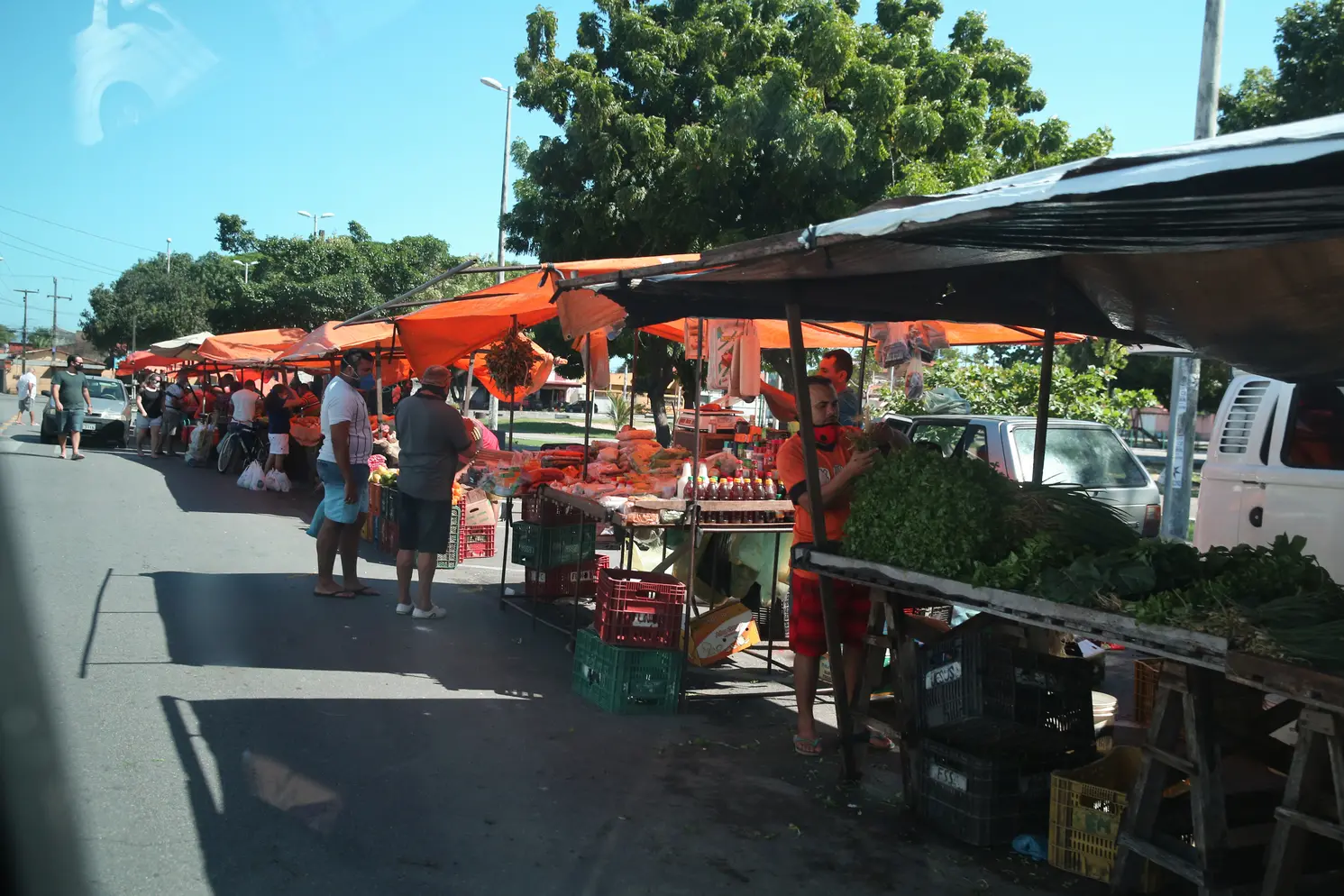 Entre barracas e carros estacionados, ontem (14), frequentadores da feira do Jardim Iracema circulavam livremente. Até as 7h24, o ambiente ao ar livre não estava lotado, mas o uso da máscara não era unânime. O equipamento de proteção individual (EPI) era visto hora no rosto, hora sob o queixo de comerciante e clientes. Em alguns casos, a máscara fora inteiramente descartada. Já na feira do Conjunto Polar, o movimento era menos intenso. Por volta de 9h30, grupos pequenos visitavam a única fileira de barracas erguidas, e o uso de EPIs era mais frequente.
