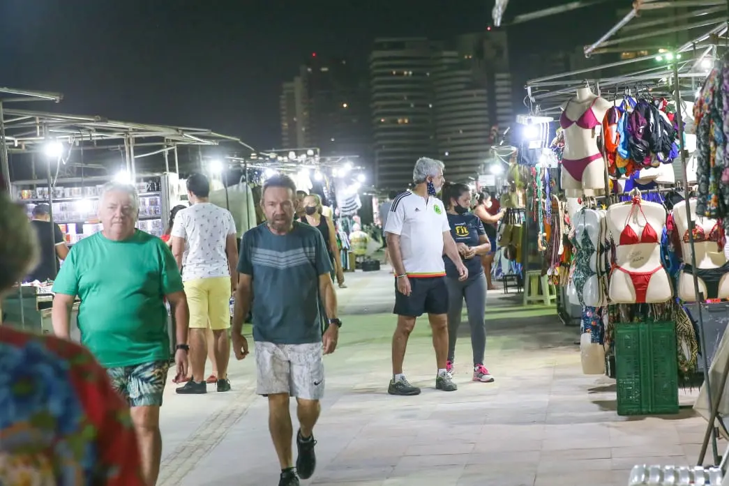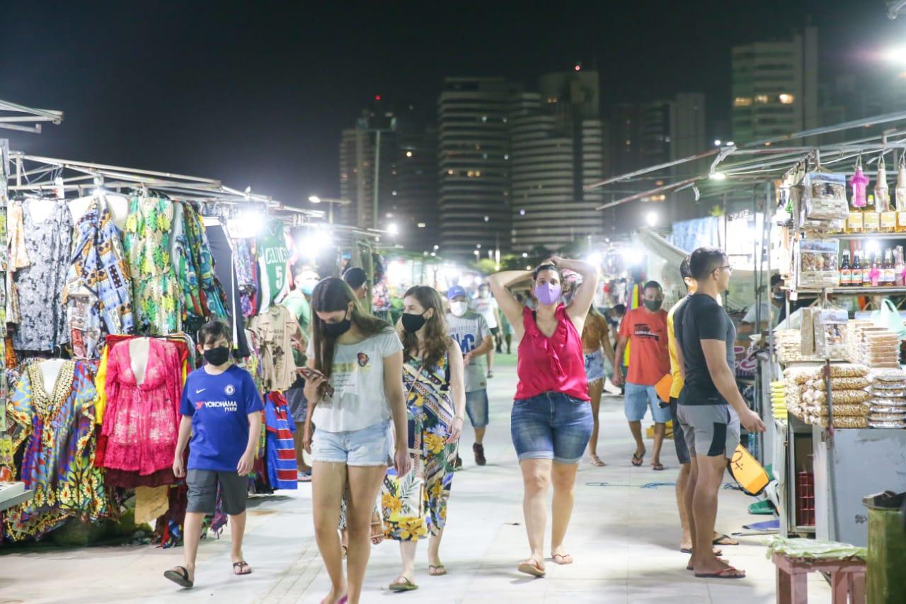 Em nota, a Agência de Fiscalização de Fortaleza (Agefis) informou que está realizando abordagem orientativa aos feirantes que estão com boxes funcionando na Av. Beira Mar para alertá-los acerca da proibição do funcionamento de feiras, conforme determinações dos decretos estaduais e municipais de enfrentamento à Covid-19.