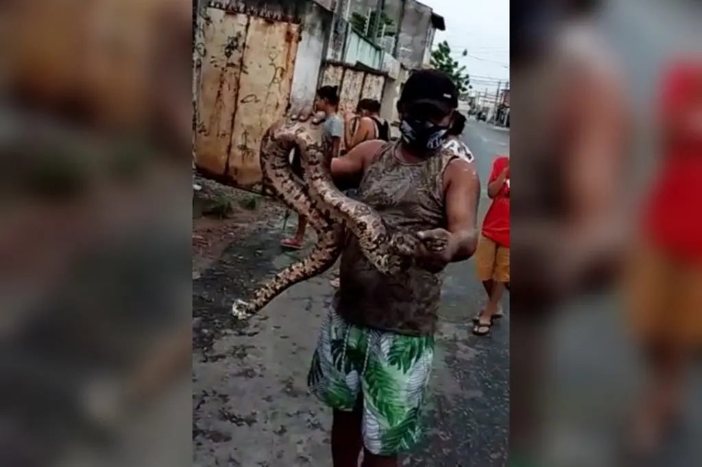Morador resgata jiboia no bairro Parque Manibura, em Fortaleza