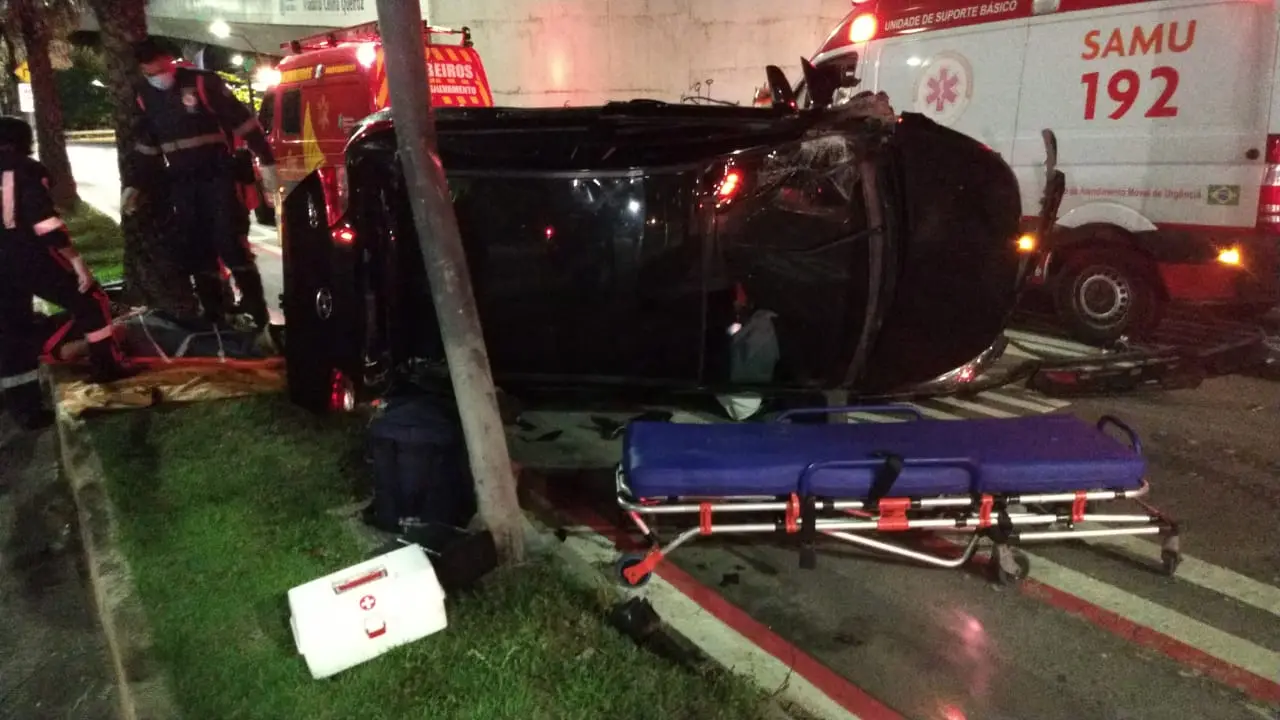 Motorista perde o controle da direção, bate no meio-fio e em poste, e tomba carro no bairro Cocó