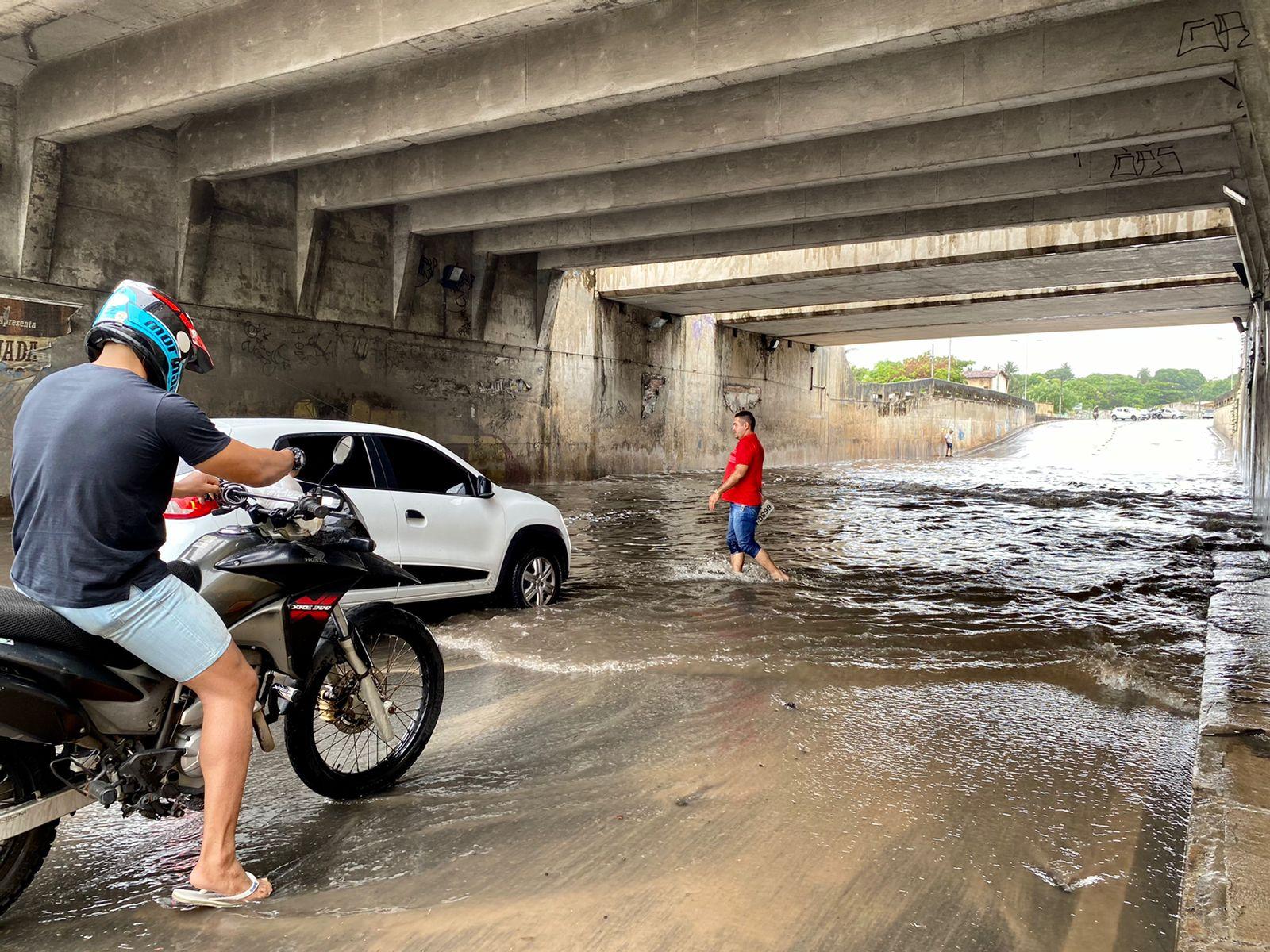 Motoristas perdem placas de veículos ao tentarem passar por túnel alagado no Mondubim; vídeo e fotos