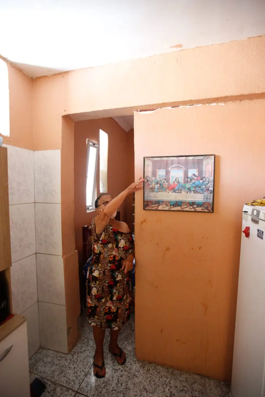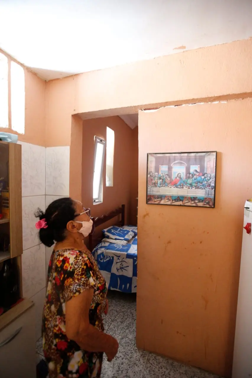 Dona Rita Nogueira tem 82 anos, há dois mora no bairro Carlito Pamplona. O impacto da pressão da explosão deixou as janelas de vidro da casa onde mora quebradas, além de rachaduras no teto e nas paredes, uma delas ficou solta.