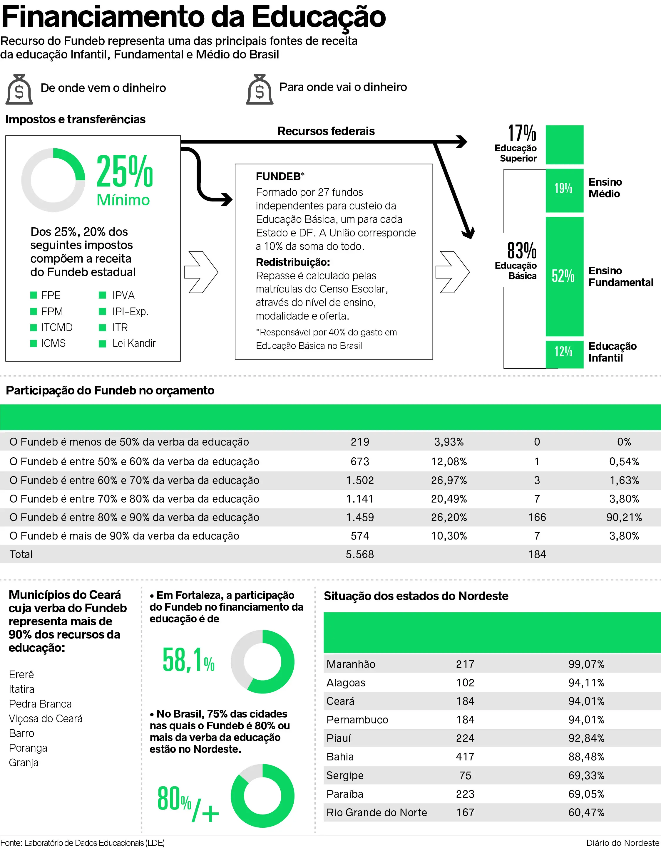 No Estado, a exemplo da Região Nordeste, somente na Capital a participação do Fundeb no financiamento da educação não extrapola os 60%. Em 2019, conforme a Associação dos Municípios do Estado do Ceará (Aprece), as 184 prefeituras juntas receberam no total 5,3 bilhões do Fundo. Este ano, entre janeiro e junho foram 2.7 bilhões para custeio e investimento na educação municipal. No Nordeste, o Maranhão e Alagoas têm situações de maior dependência desse dinheiro.