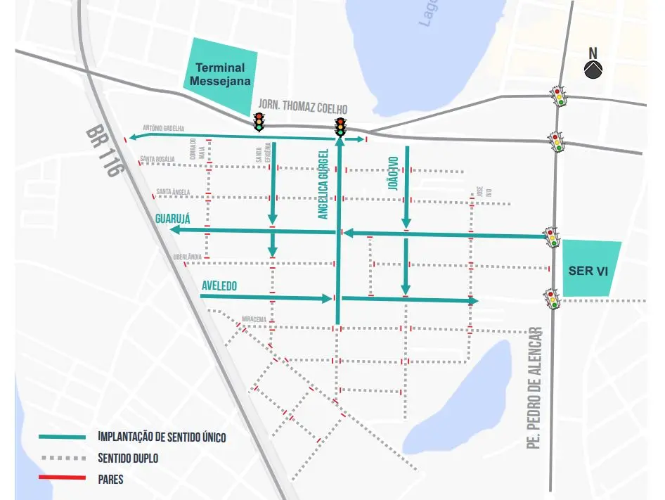 A Rua Angélica Gurgel vai passar a operar apenas com fluxo sul/norte (Ancuri-Messejana), no trecho entre a Rua Aveledo e a Avenida Jornalista Tomaz Coelho.