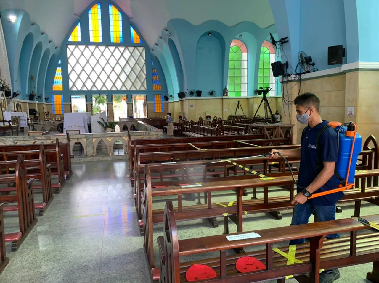 Tudo que é orientação estamos cumprindo: máscara, distanciamento, álcool em gel. Também aproveitamos os momentos de preleção para orientar a comunidade sobre os cuidados"