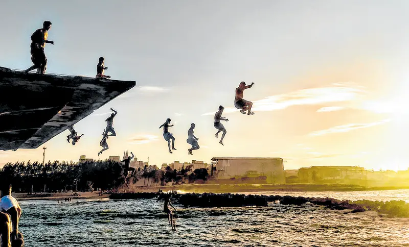 É bonito ver os mais ousados que enfrentam altura maior, dão mortais, fazem alegorias no ar. Mas também admirar os que saltam pela primeira vez e ficam intermináveis minutos na borda da ponte sem coragem para pular. Além de vencer o medo, esses precisam de incentivo e torcida. E isso não falta por lá. As mulheres são minoria e se arriscam, sempre ladeadas pelos amigos. Ali o mar também é bom para banho, e as ondas atraem surfistas da cidade.