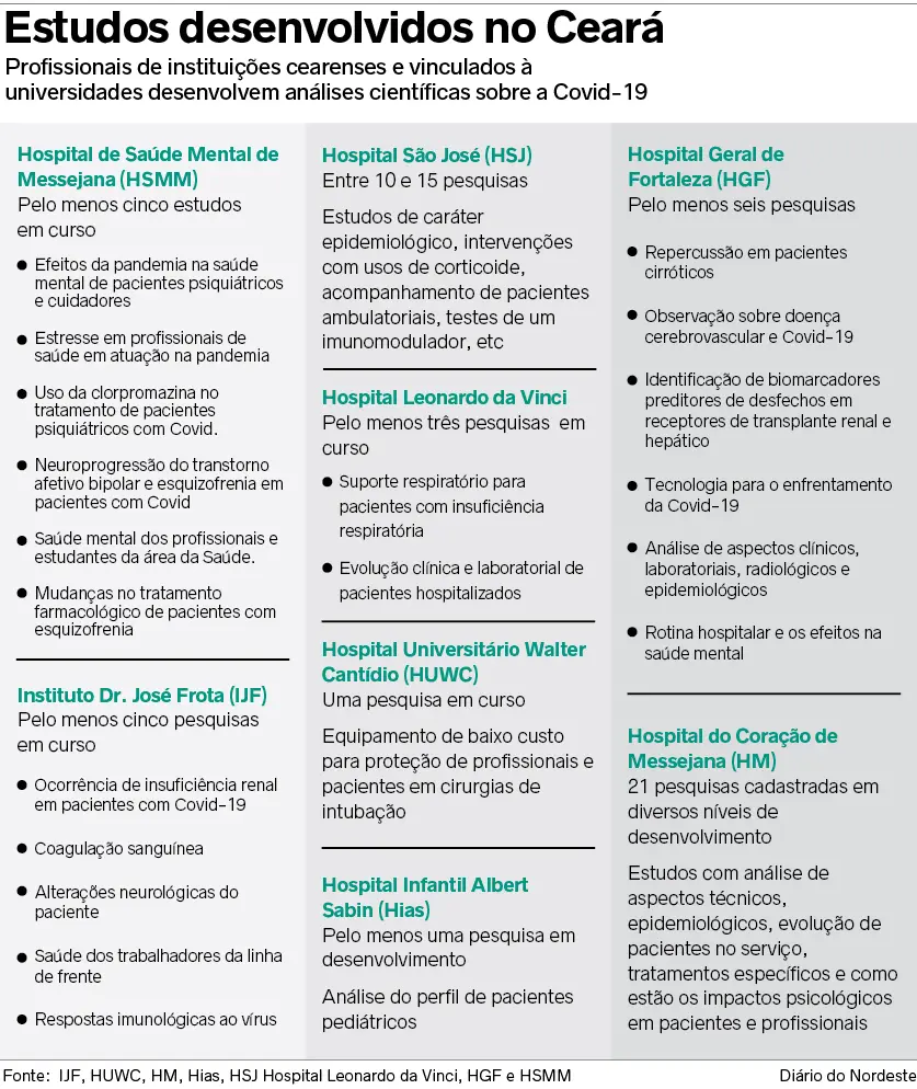 Na rede pública estadual, há distintas pesquisas acontecendo no Hospital de Messejana Dr. Carlos Alberto Studart Gomes, no Hospital São José, Hospital Infantil Albert Sabin, Hospital Geral de Fortaleza, Hospital Leonardo da Vinci e Hospital de Saúde Mental de Messejana Professor Frota Pinto. Além dessas unidades, o Instituto Dr. José Frota, da rede municipal, e o Hospital Universitário Walter Cantídio, unidade vinculada ao Governo Federal, também têm estudos em curso sobre a Covid-19.