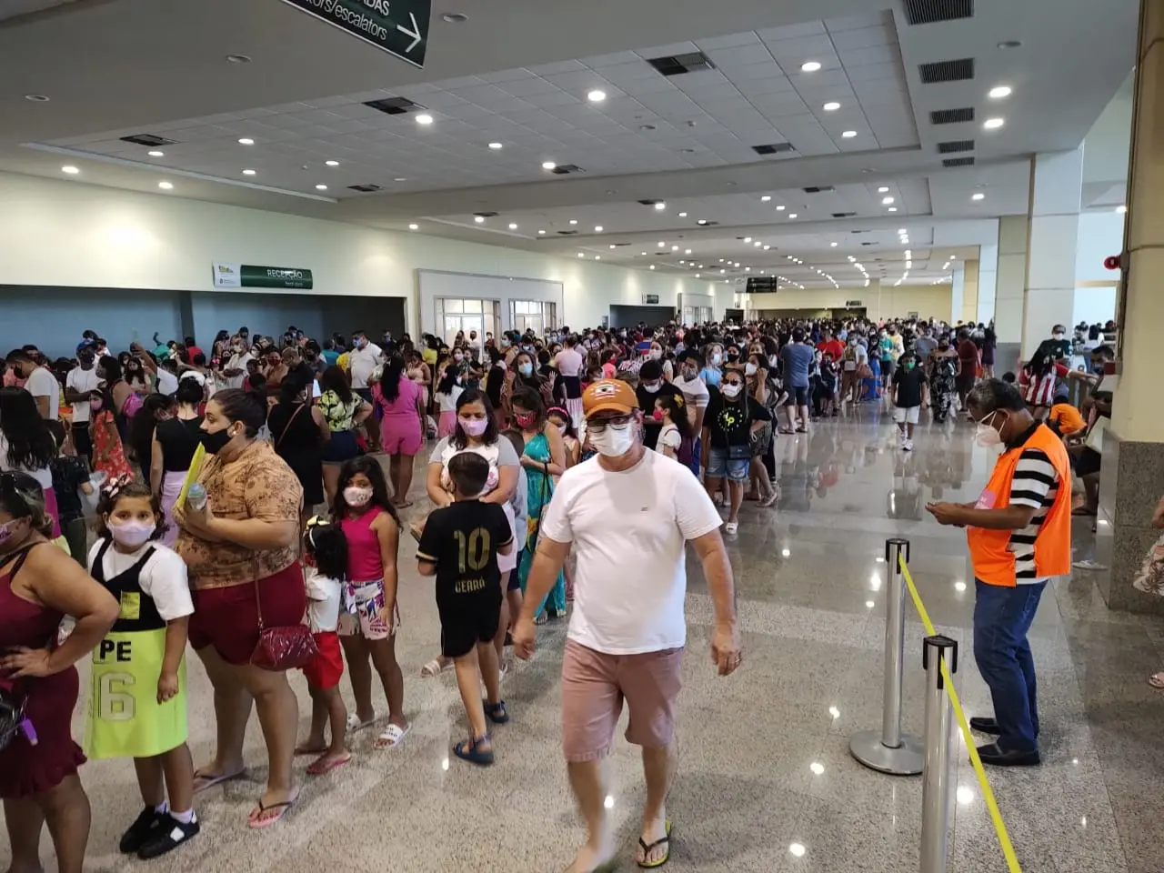 "É uma fila que vai e volta de uma ponta a outra do salão, e ainda deve ter mais fila lá dentro. Isso aqui vai demorar muito tempo, com muita aglomeração e desnecessária", diz, acrescentando que a longa espera é ainda mais "cansativa" para as crianças.