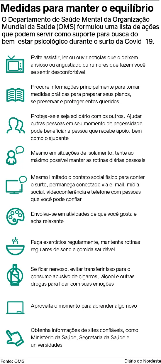 Fernando esclarece que não há fórmulas para enfrentar o momento e garantir equilíbrio psíquico e emocional, mas a ciência estuda para encontrar “pistas” de como lidar com essas situações de grande impacto. Psicólogos clínicos, explica, orientam a adoção de algumas estratégias que podem ajudar a enfrentar os efeitos da pandemia. Dentre as ações está compreender o que está acontecendo a partir de informações concretas, aproveitar o tempo de recolhimento para experimentar atividades que no cotidiano não eram desenvolvidas, tentar contribuir para que pessoas da sua rede se mantenham protegidas e desenvolver formas comunitárias de usos de recursos de enfrentamento.