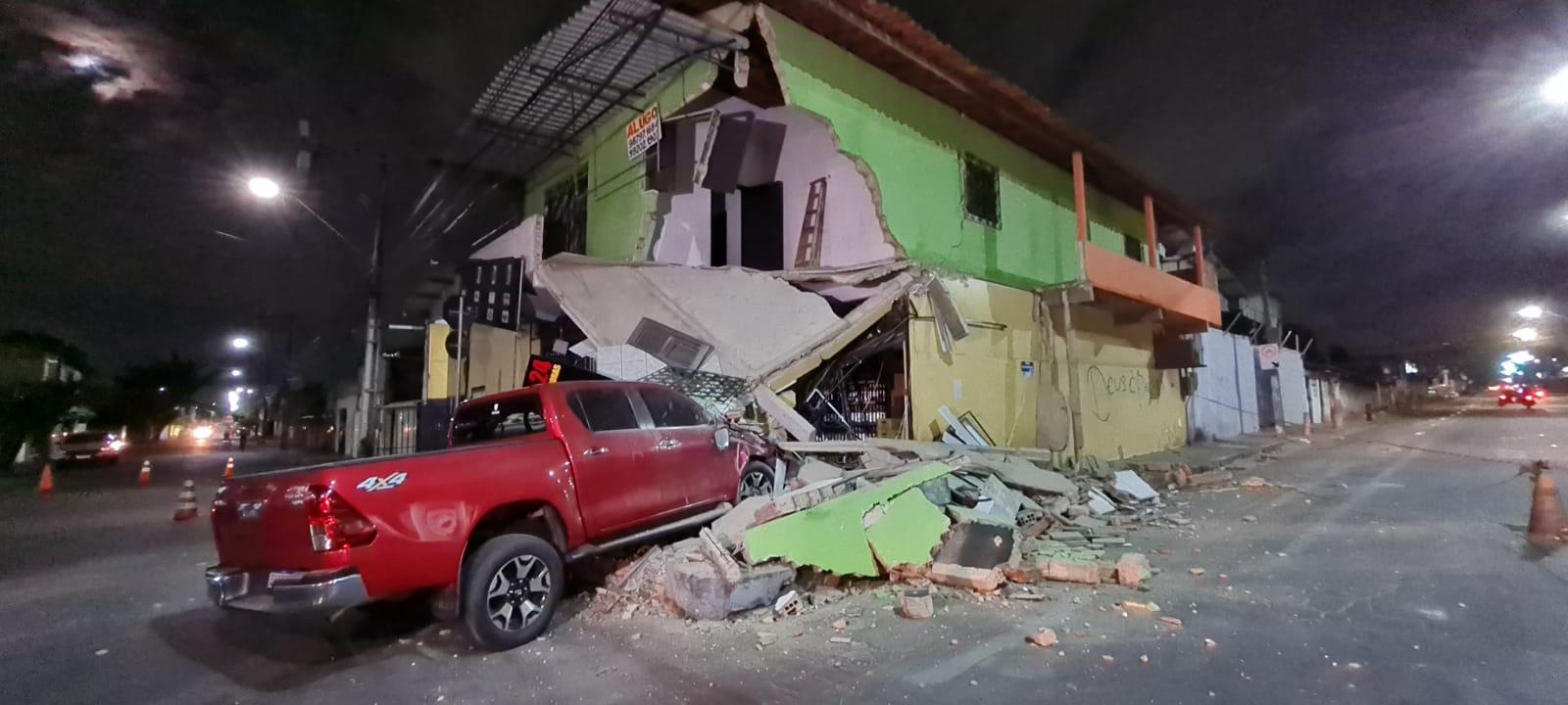 Parte da estrutura de prédio atingido por caminhonete desaba no bairro Bonsucesso, em Fortaleza