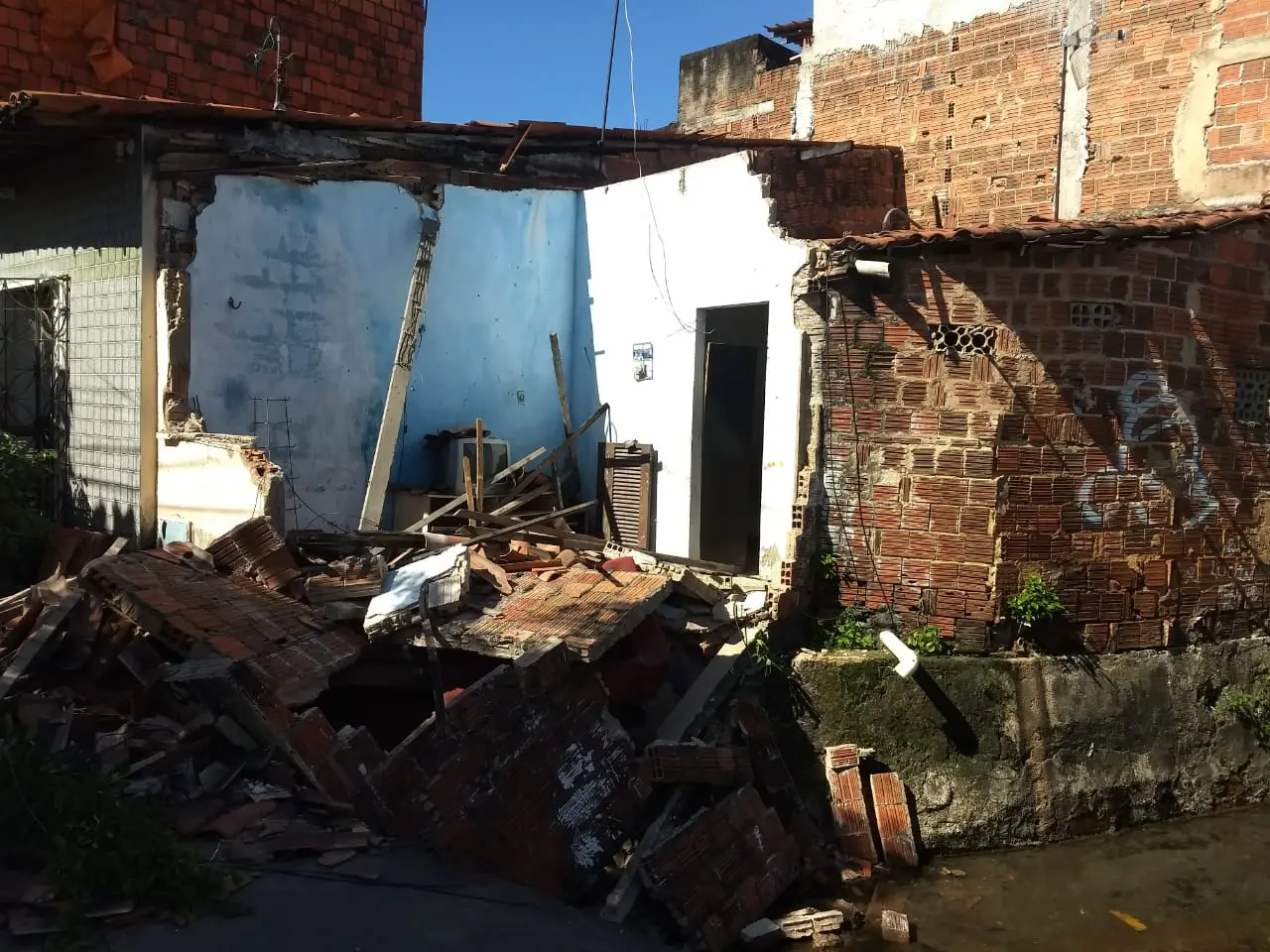 Parte de casa desaba às margens de canal no Bairro Quintino Cunha