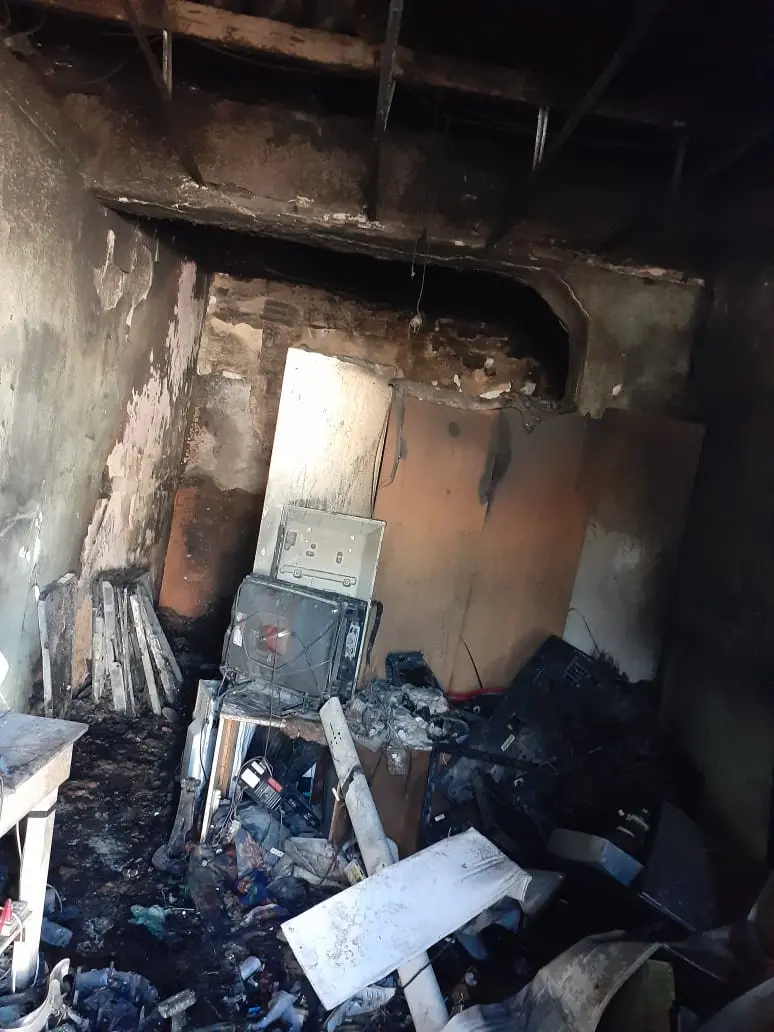 O incêndio deixou a casa destruída. O interior da residência foi totalmente danificado e parte da estrutura do teto cedeu.
