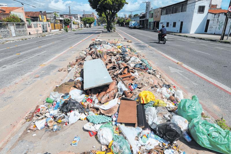 Na Avenida Domingos Olímpio, uma das mais movimentadas de Fortaleza, caixas, sacos plásticos, entulhos e restos de alimentos se aglomeram ao redor dos postes da iluminação pública. No cruzamento com a rua Padre Mororó o acumulo já causa desconforto entre moradores e comerciantes.