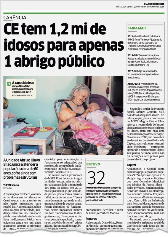 Idosos cearenses sem dinheiro, família ou condições de permanecer nela têm apenas uma opção pública: o Abrigo Olavo Bilac, mantido em Fortaleza pela Secretaria de Proteção Social, Justiça, Cidadania, Mulheres e Direitos Humanos (SPS). A Instituição é alvo, desde 2013, de recomendações de reformas pelo MPCE, "todas atendidas até 2018", conforme a SPS. Na última vistoria do MP, em março de 2019, porém, o alvará de funcionamento e a licença sanitária do local estavam vencidos.