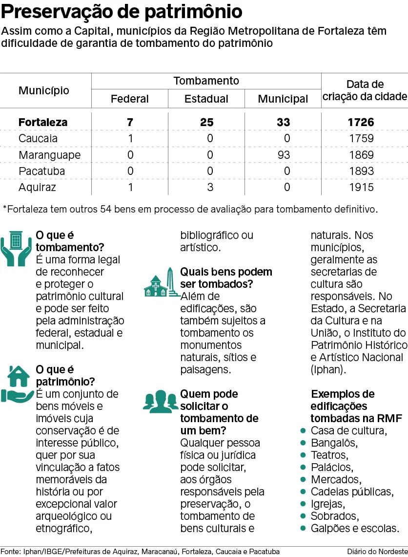Em Caucaia, há apenas um bem tombado e ainda na esfera federal pelo Instituto do Patrimônio Histórico e Artístico Nacional (Iphan), a Biblioteca Pública. Já em Aquiraz - primeira vila do Ceará criada ainda em 1699 -, segundo a Prefeitura, há somente quatro edificações tombadas. Nenhuma delas pelo Município. Três são protegidas pelo Governo do Estado e uma pelo Governo Federal. Na cidade, é tombado pelo Iphan o Mercado da Carne, enquanto o Museu Sacro São José de Ribamar, a Casa do Capitão-Mor e a Igreja Matriz São José de Ribamar são protegidos pelo Estado.