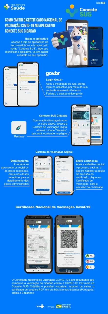 O comprovante pode ser acessado após a finalização do esquema vacinal via site ou pelo aplicativo ConecteSUS, mecanismo que agrupa informações ligadas à Rede Nacional de Dados em Saúde (RNDS).