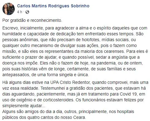 O secretário da Saúde do Estado do Ceará, Dr. Cabeto, usou as redes sociais nesta sexta-feira (19) para agradecer pelo empenho aos profissionais envolvidos no combate à Covid-19 em solo cearense. Na publicação, o titular da pasta citou caso de gratidão dos pacientes registrado por ele na Unidade de Pronto Atendimento (UPA) do Cristo Redentor, em Fortaleza.