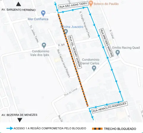 Com o bloqueio, os motoristas que se dirigem à Av. Bezerra de Menezes vão ter de fazer desvios pelas ruas São Judas Tadeu e Eretides Martins, que passará a operar com sentido duplo de circulação entre as ruas São Judas Tadeu e Heráclito Domingues.