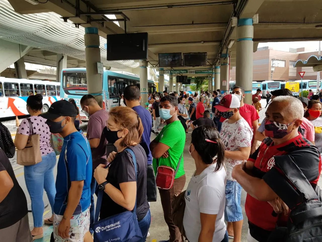 Longas filas e aglomerações ainda são realidade na vida de quem precisa utilizar o transporte coletivo em Fortaleza, mesmo após 10 meses do início da pandemia de Covid-19. Na última segunda-feira (11) e na manhã desta terça (12), o Sistema Verdes Mares percorreu os terminais do Papicu, do Siqueira e da Parangaba e registrou muitos passageiros sem distanciamento social.