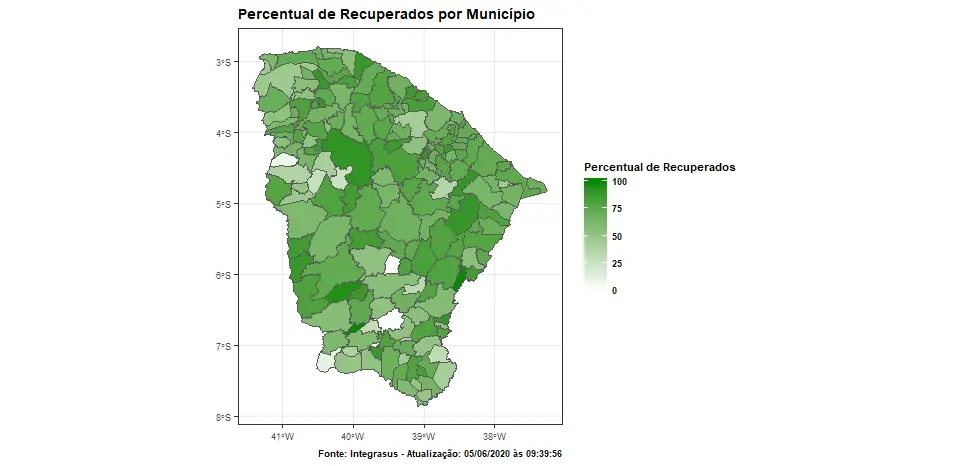 Dos 184 municípios do Ceará, sete registram que mais de 90% dos pacientes diagnosticados com Covid-19 estão recuperados, segundo a plataforma IntegraSUS, atualizada pela Secretaria Estadual da Saúde (Sesa), às 9h39 desta sexta-feira (5).