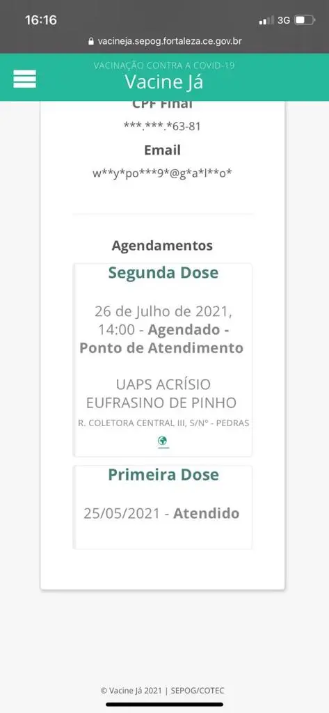 A segunda dose estava agendada para às 10h de hoje (26), no bairro Demócrito Rocha. Do centro de vacinação, foi encaminhado até o Cuca da Barra, onde recebeu o imunizante ao apresentar a captura de tela da plataforma Vacine Já.