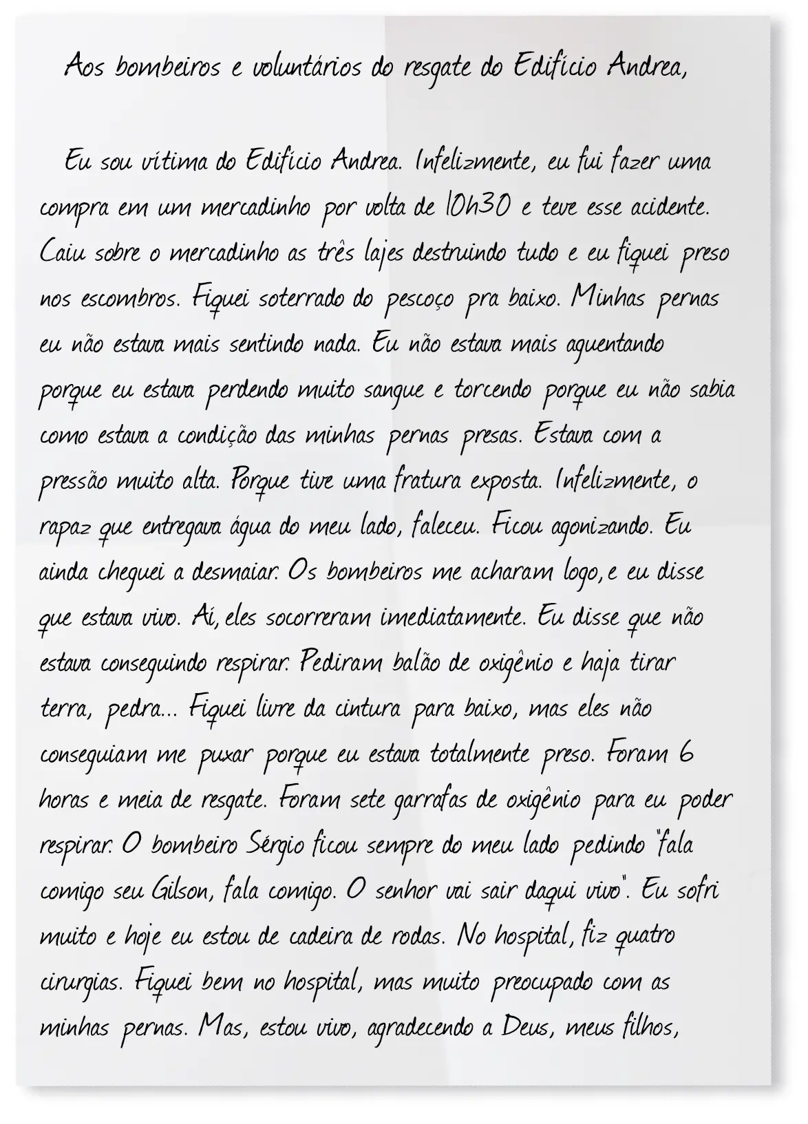 Em carta aos bombeiros e voluntários sobreviventes da queda de edifício, no Dionísio Torres, as vítimas narram sensações de esperança e gratidão. Elas ressaltam e reconhecem a coragem dos "heróis desconhecidos"