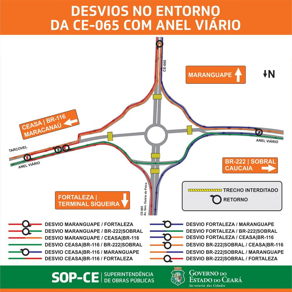 A partir desta quarta-feira (23), motoristas que utilizam o Anel Viário devem ficar atentos aos novos desvios na conexão com a CE-065, em Maranguape. É a segunda etapa de desvios nesse trecho, que vai bloquear a antiga rotatória do cruzamento e direcionar todo o trânsito para as alças de acesso já construídas, com retornos feitos ao longo das rodovias.
