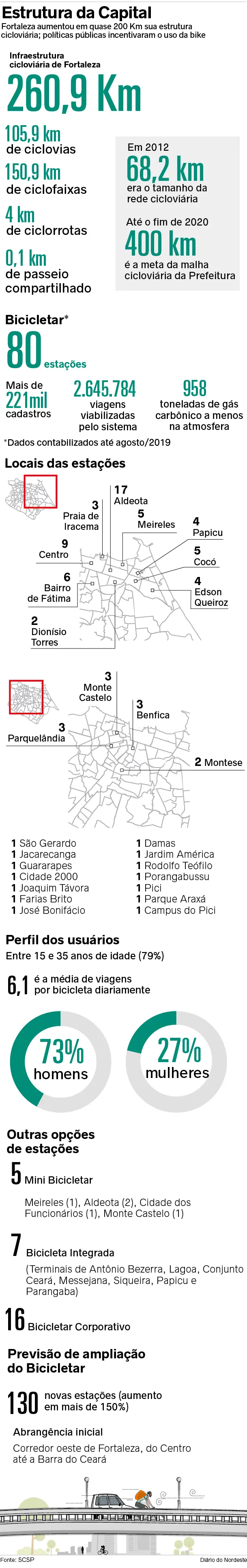 Conforme o Diário do Nordeste publicou, na edição do último dia 16, a pesquisa Origem-Destino, que vem sendo desenvolvida pela Prefeitura desde fevereiro deste ano, aponta que 84% dos ciclistas de Fortaleza utilizam a bicicleta para se locomover ao trabalho ou ao estudo. Conforme a análise, um a cada três deslocamentos na Capital é realizado a pé ou de bicicleta.