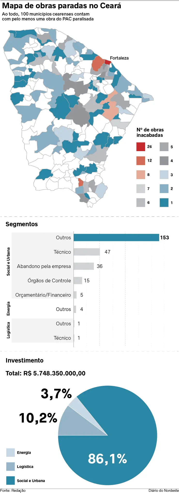 De acordo com o estudo, o Ceará concentra 5,6% dos empreendimentos do programa paralisados no País, que totalizam 4.669. Fortaleza é a cidade cearense com mais obras paradas, totalizando 26, das quais duas de infraestrutura social e urbana e 24 de infraestrutura logística. Em seguida aparecem Caucaia (12), Juazeiro do Norte (12), Morada Nova (8) e Alto Santo, com 7 empreendimentos paralisados. Ao todo, 100 municípios cearenses contam com pelo menos uma obra parada. No Ceará, o valor total dos empreendimentos atrasados que contam com recursos do PAC somam R$ 5,7 bilhões.