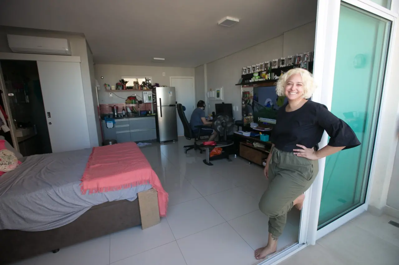 Tendo morado a vida inteira em uma casa de dois andares, a professora Letícia Mota, de 28 anos, confessa que ainda se assusta ao chegar em casa e perceber a pequenez do espaço que chama de lar. A jovem mora com o noivo em um apartamento com área total de 33 m², sem distinção de paredes entre quarto, sala e cozinha.