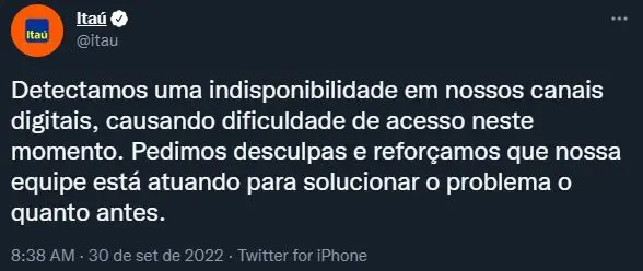 A informação foi confirmada logo depois, pelo próprio Itaú, em conta oficial no Twitter. "Identificamos uma indisponibilidade no acesso ao app e já estamos cuidando disso. Fique tranquilo que logo será normalizado", explicou o banco.