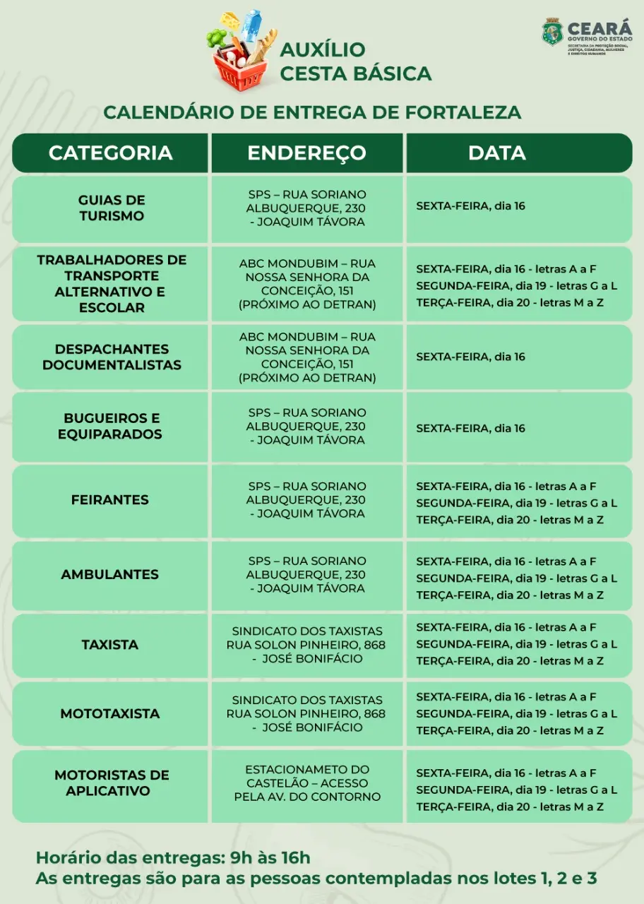 O calendário e os locais de entrega do auxílio cesta básica no Ceará foram divulgados hoje (15) pelo Governo do Estado, após transmissão do governador Camilo Santana nas redes sociais.
