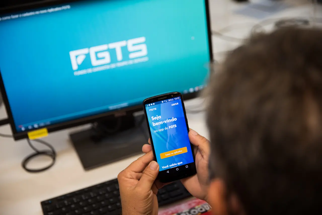 Foto de trabalhador acessando aplicativo do FGTS