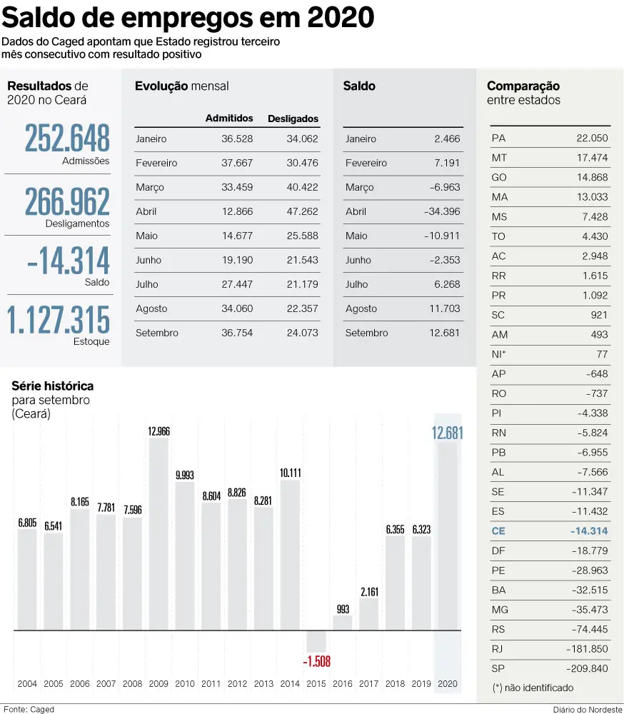 A recuperação do mercado de trabalho no Ceará tem se dado de maneira pujante após o início do Plano de Retomada Responsável das Atividades Econômicas e Comportamentais do Governo do Estado, em junho. Segundo o Cadastro Geral de Empregados e Desempregados (Caged), divulgado ontem (29) pelo Ministério da Economia, em setembro, o Estado gerou 12,6 mil novas vagas de emprego formal - melhor resultado para o mês desde 2009, quando foi registrado um saldo de 12,9 mil oportunidades.