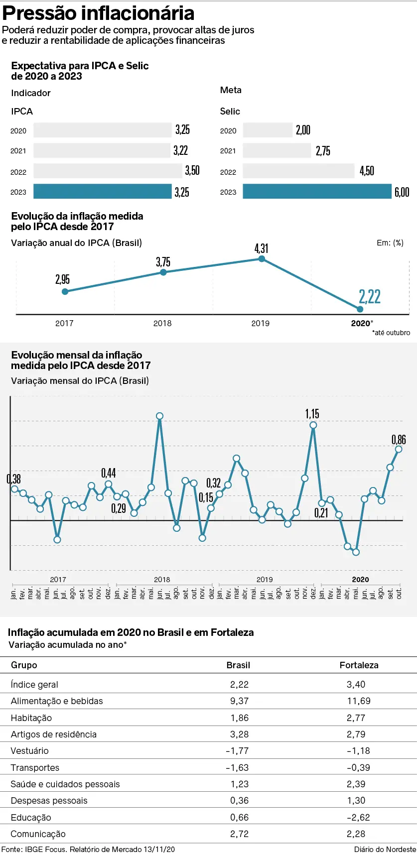 “Mesmo com a alta dos últimos meses nos preços dos alimentos, existe a perspectiva de a inflação desse grupo não se acelerar tanto em dezembro de 2020 como foi em 2019, levando a uma inflação ainda comportada no fim deste ano”, prevê Daniel Suliano, analista do Instituto de Pesquisa e Estratégia Econômica do Ceará (Ipece).