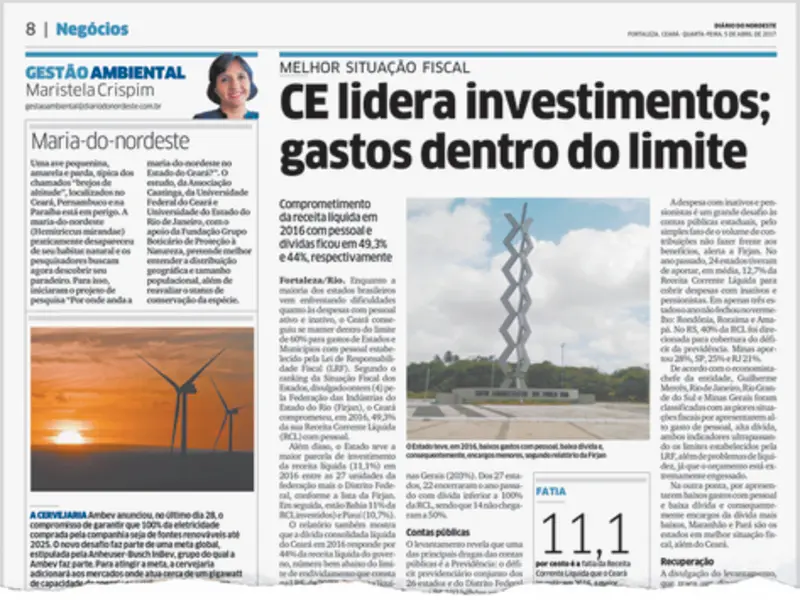 Ao garantir 11,1% da receita líquida estadual para investimentos, o Ceará conquistou a primeira colocação no ranking da Federação das Indústrias do Estado do Rio de Janeiro (Firjan), que anualmente analisa cinco indicadores das contas públicas de todos os estados brasileiros. Além disso, o governo cearense garantiu-se abaixo dos limites estabelecidos pela Lei de Responsabilidade fiscal (LRF), ao destinar 49,3% da receita líquida de 2016 para o gasto com pessoal e 44% para as dívidas. Assim, o Ceará figurou como o estado com melhor situação fiscal do Brasil, segundo a Firjan.