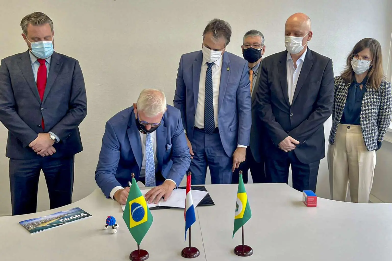 O governo do Estado assinou o 11º memorando de entendimento para produção de hidrogênio verde no Complexo do Pecém. O acordo foi firmado entre o governador Camilo Santana e o consórcio Transhydrogen Alliance nesta quarta-feira (27) em Roterdã, na Holanda.