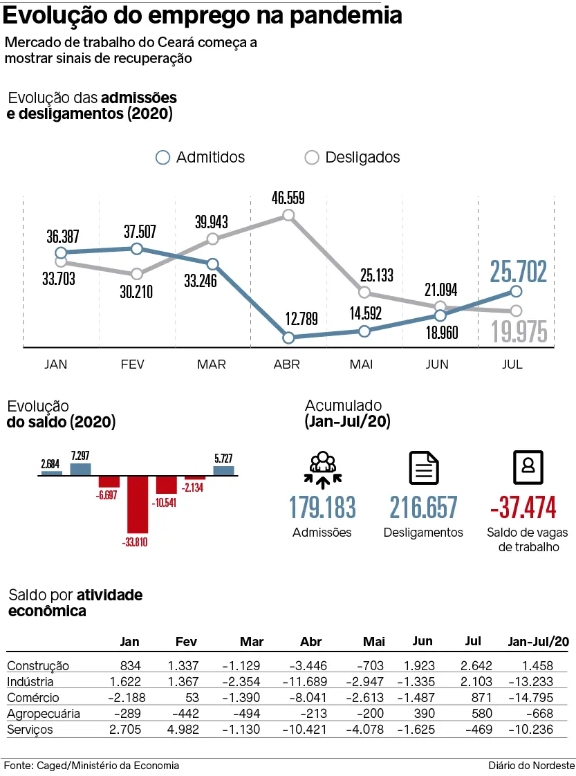 Após quatro meses de perdas em decorrência da pandemia do novo coronavírus, o mercado de trabalho formal cearense voltou a registrar criação de novas vagas de emprego em julho. Dados do Cadastro Geral de Empregados e Desempregados (Caged), divulgados ontem (21) pelo Ministério da Economia, mostram que, catapultado pela indústria e pela construção civil, o saldo no sétimo mês do ano ficou positivo em 5.727 vagas, maior geração de empregos entre os estados do Nordeste.