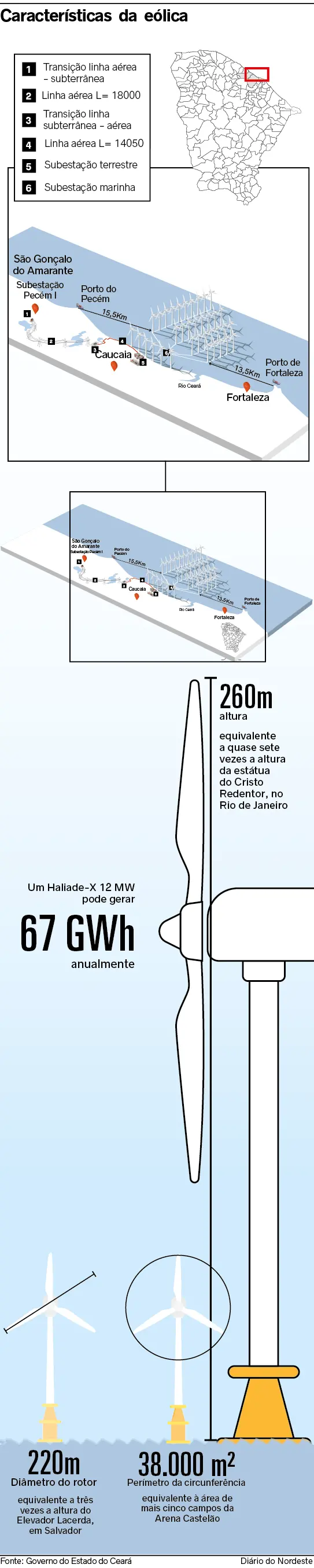 A potência prevista para o "Parque Eólico Offshore Caucaia" corresponde a cerca de 30% de toda potência eólica instalada hoje no Ceará.