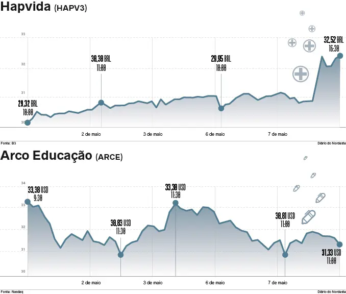 No fechamento do mercado, a Hapvida teve alta de mais de 7%, com os papéis valendo em torno de R$ 32,75.