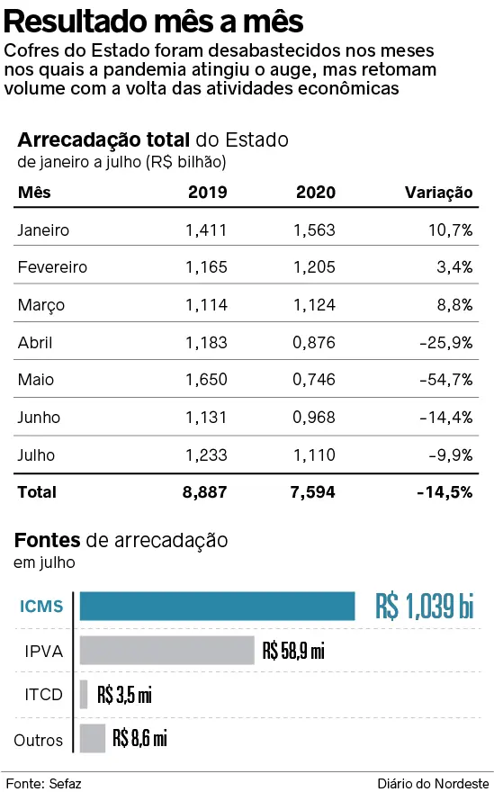 Considerando o acumulado de janeiro a julho deste ano, a arrecadação total do Ceará somou R$ 7,594 bilhões, uma perda real de 14,5% em comparação a igual período de 2019 (R$ 8,887 bilhões).