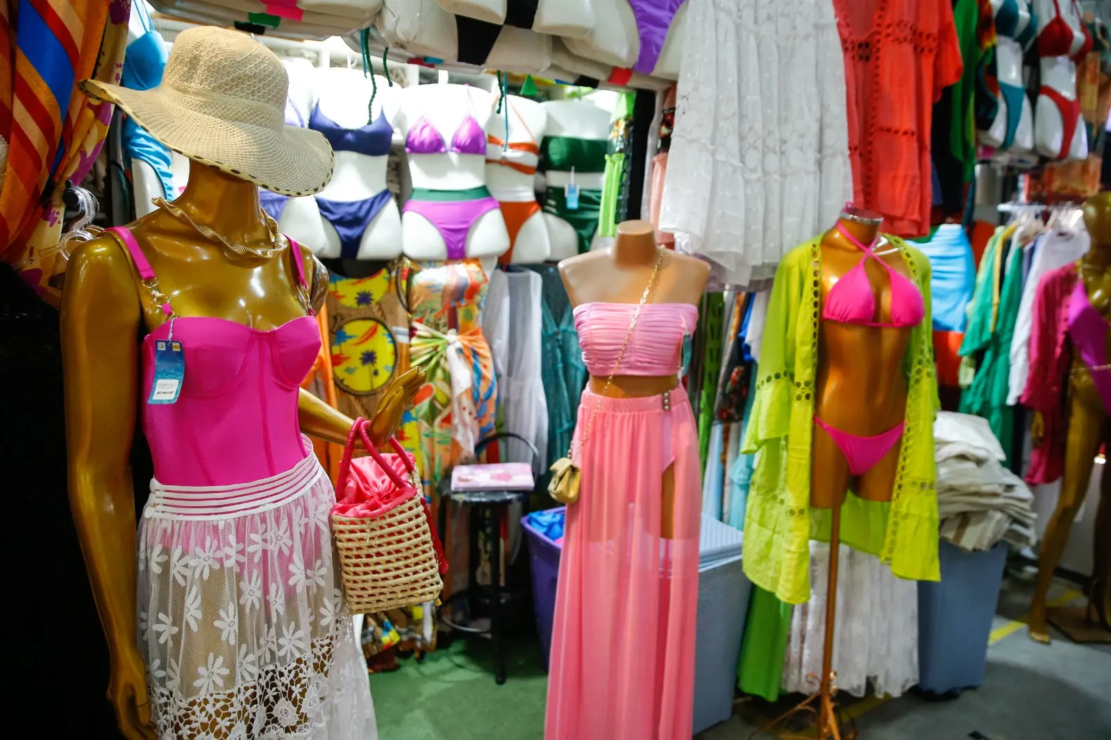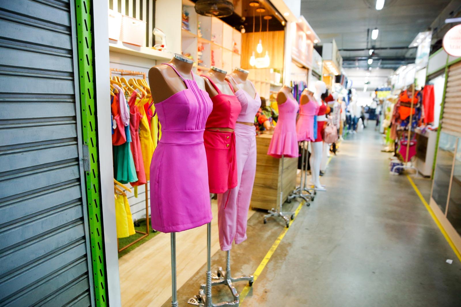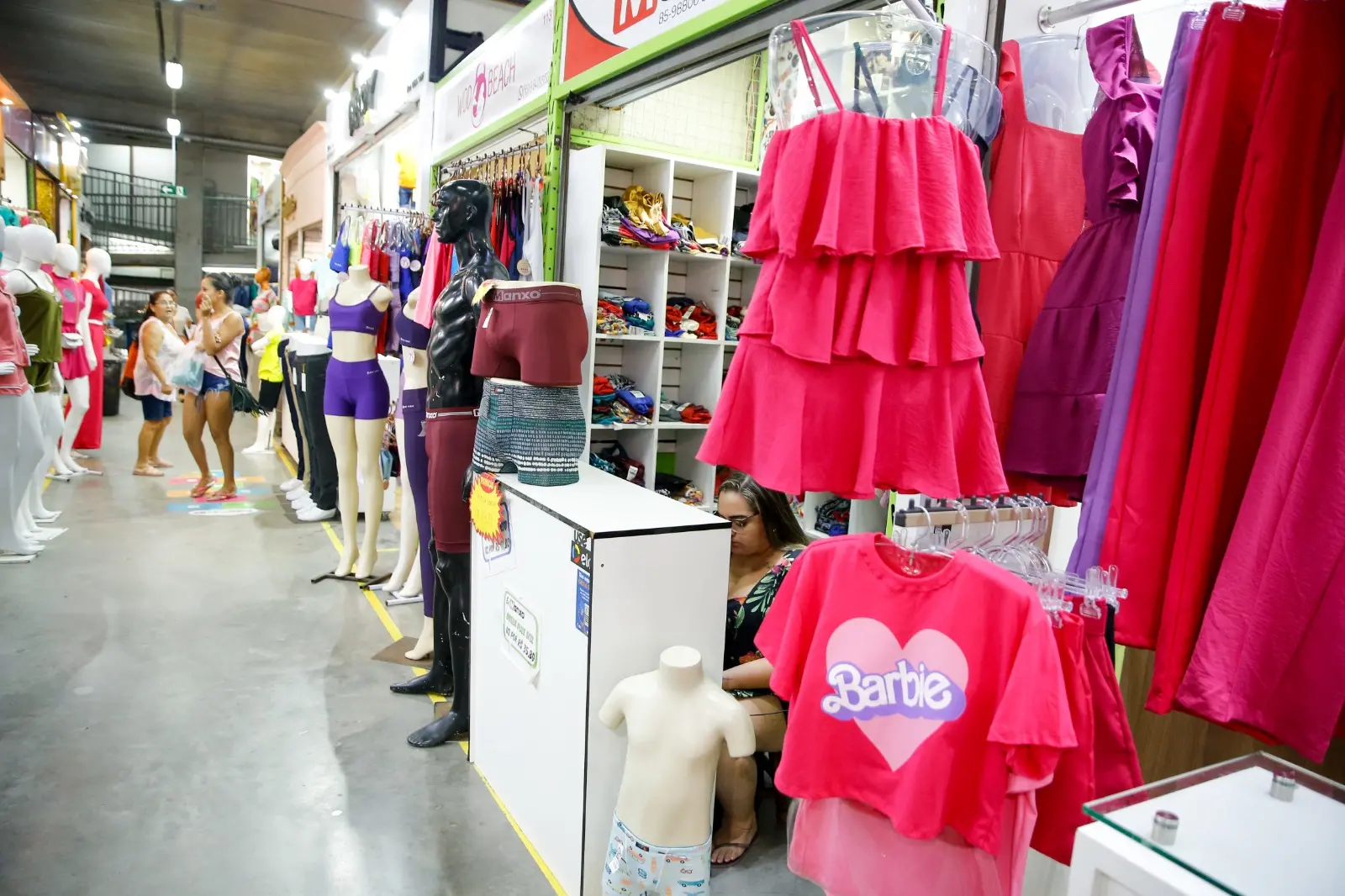 No Centro Fashion, vários boxes expõem roupas rosas nas araras e manequins a fim de chamar atenção de quem passa em busca de um look para assistir ao filme da Barbie no cinema.