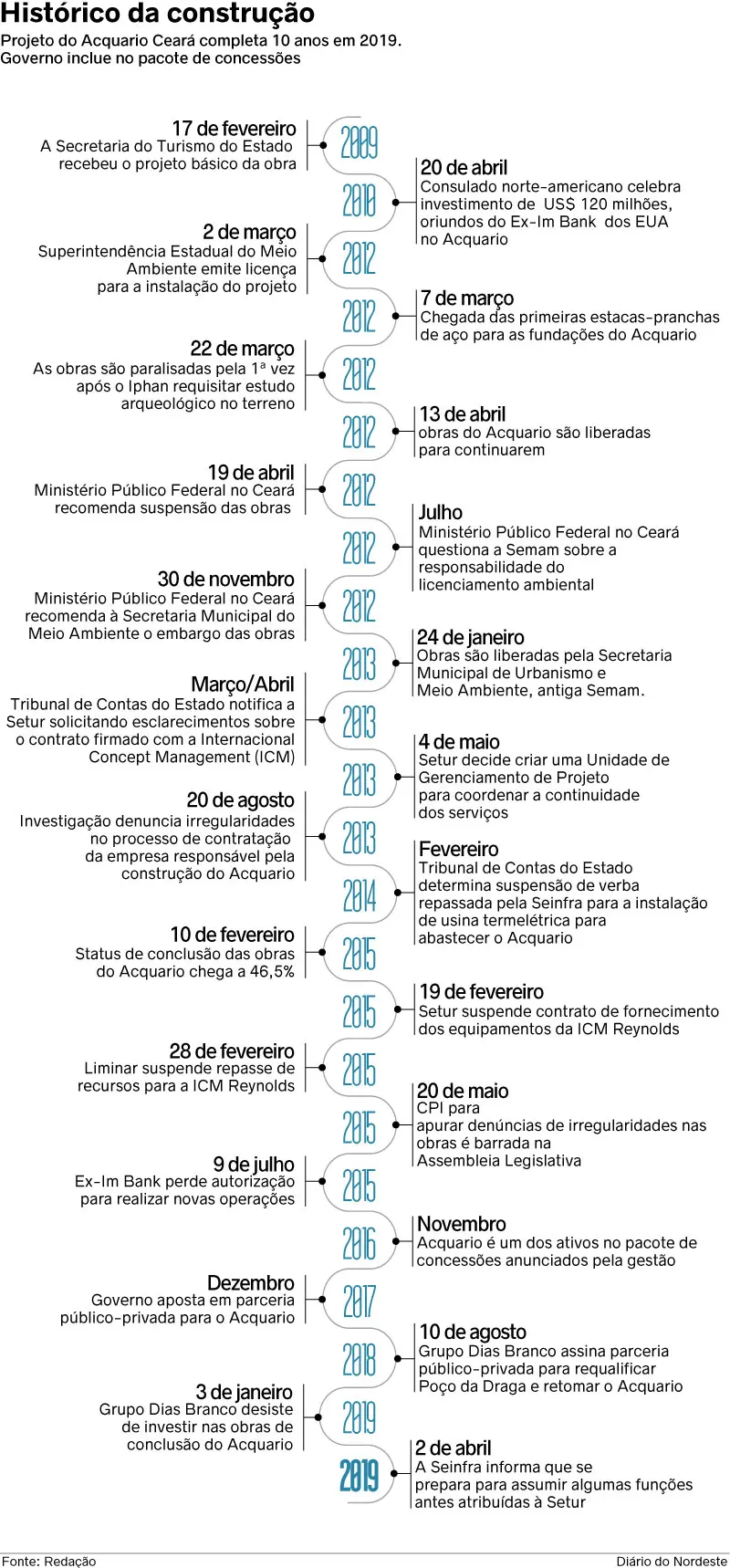 Incluído no pacote de concessões estaduais em agosto de 2016, o início do processo de concessão do Acquario Ceará estava previsto para ocorrer no primeiro semestre do ano passado, com o lançamento do edital de concessão do equipamento, mas o processo não andou.