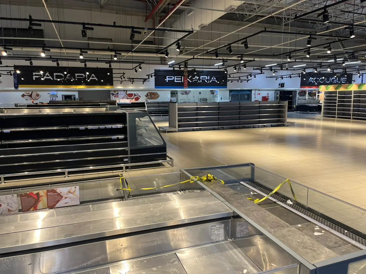 Ainda é possível observar a reposição constante, embora em menor quantidade, de produtos alimentícios, como cereais, temperos e biscoitos. A maior parte do estabelecimento está com passagem restrita a funcionários.