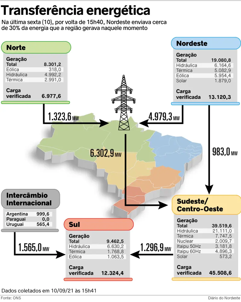 Há ainda uma parte, 983 MW, enviada diretamente da região Nordeste para o Sudeste e Centro-Oeste. O coordenador de energia da Federação das Indústrias do Ceará (Fiec) e diretor técnico da Associação Brasileira de Geração Distribuída (ABGD), Joaquim Rolim, explica que a variedade energética da região permite ao Nordeste contribuir com outras localidades.