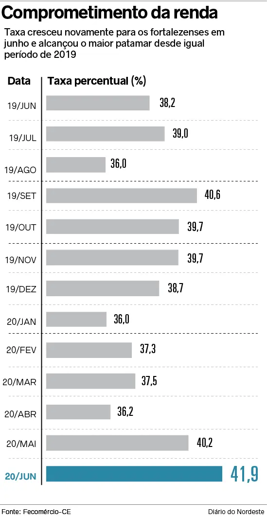 O desemprego em alta e as incertezas sobre o cenário econômico provocadas pela pandemia do novo coronavírus se refletem na sexta Pesquisa do Endividamento do Consumidor de Fortaleza do ano. Enquanto a parcela de pessoas com algum tipo de dívida em junho se manteve inalterada em relação a maio (74,7%), o comprometimento da renda cresceu, chegando ao maior patamar em 12 meses (41,9%).
