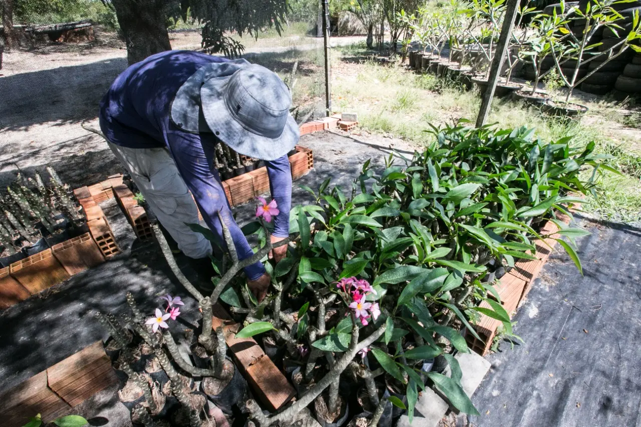Do primeiro contato das Plumérias com a terra até enfim chegar o momento ideal em que os seus galhos serão podados e acondicionados em caixas são aproximadamente três anos, de acordo com o produtor e presidente da Câmara Setorial de Plantas Ornamentais, Gilson Gondim.