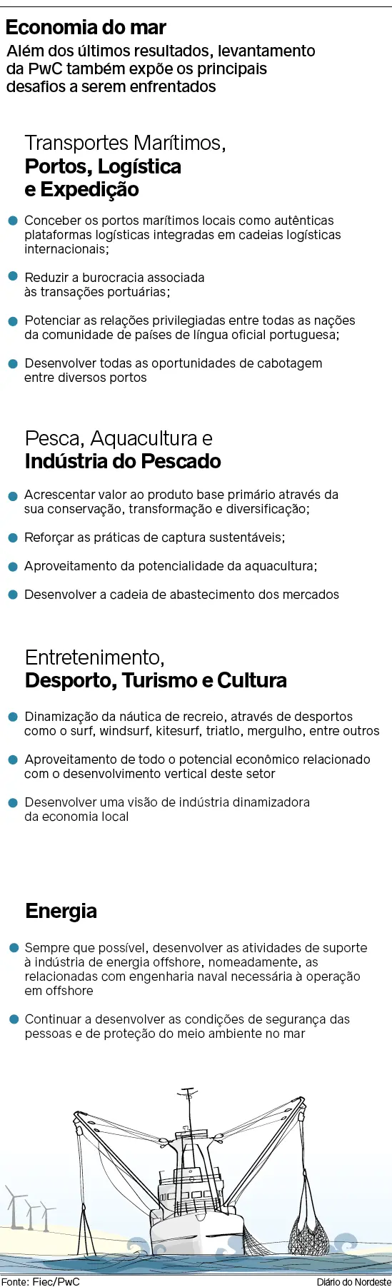 A projeção é feita pelo sócio e líder do Centro de Excelência Global da PricewaterhouseCoopers (PwC) para o Mar, Miguel Marques. Ele revela que o Ceará está tomando a liderança nacional das indústrias do mar. "Acompanhamos o Estado há três anos e o diferencial é que aqui temos todas as atividades relacionadas à economia azul", destaca.