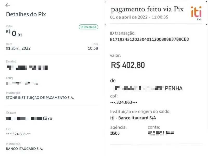 No momento que o Pix demorou a cair e no formato do comprovante eu comecei a estranhar. Quando fomos comparar com outro real comprovante do banco que ela fez o pagamento, percebemos que o mesmo tinha sido editado no Instagram”.